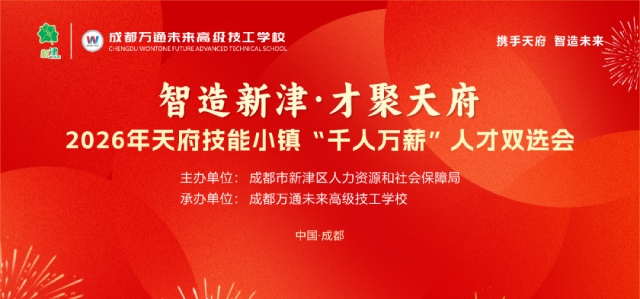 为深入贯彻“技能四川” 重点项目建设部署,落实成都市 “职业教育培优赋能” 工程,推动成渝地区双城经济圈高技能人才协同发展,由成都市新津区人力资源和社会保障局主办,成都万通未来高级技工学校承办的2026 天府技能小镇“千人万薪”汽车类与智能制造类人才专场招聘会暨万通产教融合定向委培签约仪式,将于3 月6 日在成都万通未来高级技工学校盛大启幕。本次活动以“以育引才、以才引产、以产兴城”为宗旨,依托天府智能制造产业园区域优势,聚焦新能源汽车、智能制造、工业自动化等关键领域,搭建政企校协同发展平台,为区域产业发展输送高素质技能人才。