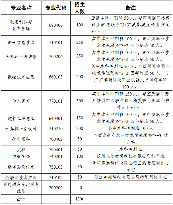 学校深化产教融合、校企合作,紧跟行业和地方经济发展,新开办了工业机器人、3D打印技术、无人机、酒类产品包装设计、WEB前端设计等前沿专业,与上汽集团、蓝海机器人、西南无人机、重庆东江实业、江南科技园区等企业共建订单班;与四川信息职业技术学校、泸州职业技术学校等高校合作,打通学生升学就业立交桥。