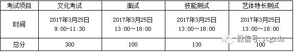 (5)2017年3月25日上午9:00~11:30文化考试;下午13:00~18:00面试、技能测试及艺体特长测试。