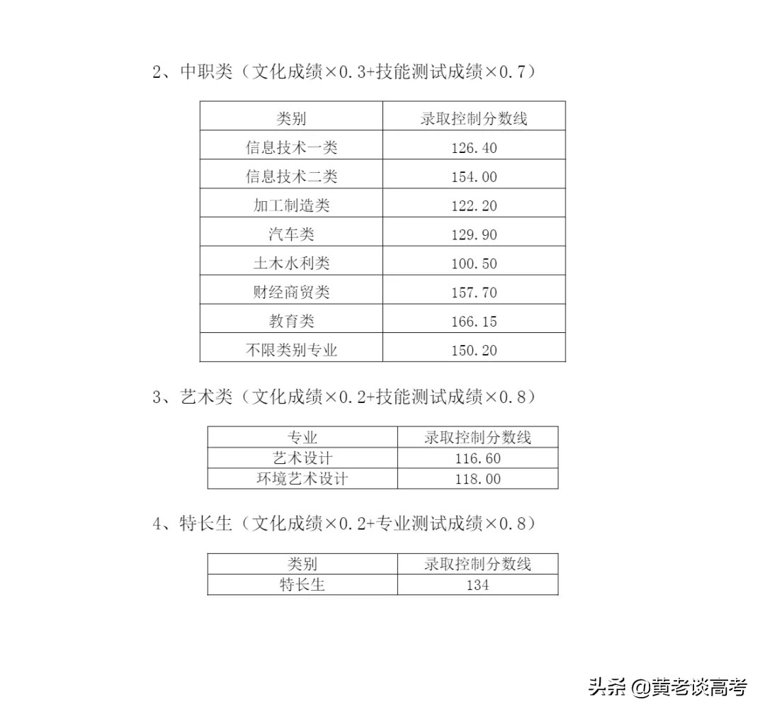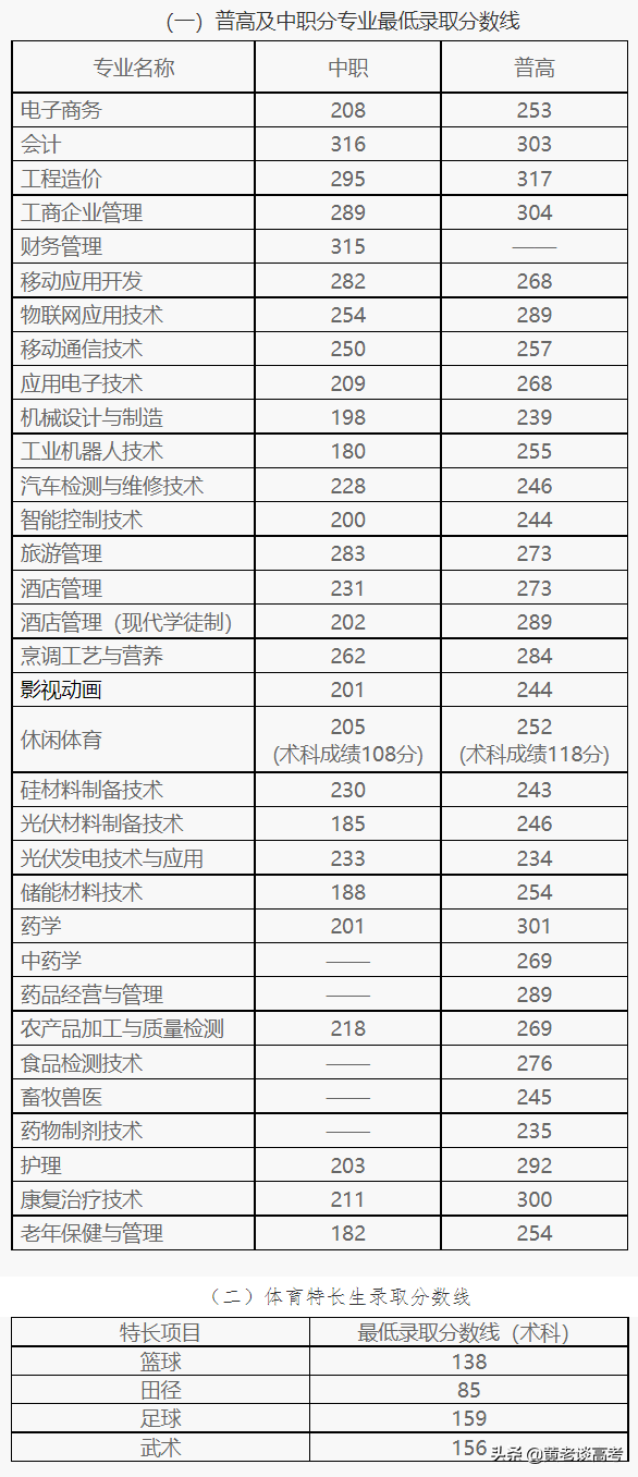 (1)特长生:文化控制线80分,录取分数线273分;(2)普高生:录取分数线282分(其中线上同分17人,按照线上成绩相同者以文化成绩排序,淘汰14人。线上282分者,文化最低139分);(3)中职生:录取分数线303.33分(其中线上同分5人,按照线上成绩相同者以文化成绩排序,淘汰2人。线上303.33分者,文化最低109分)。