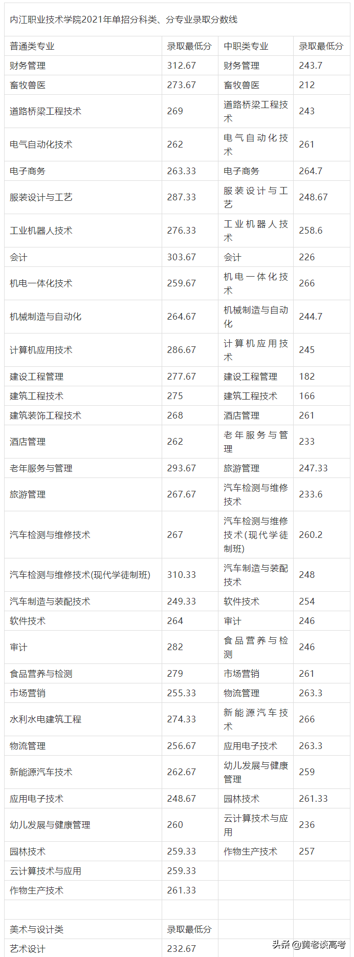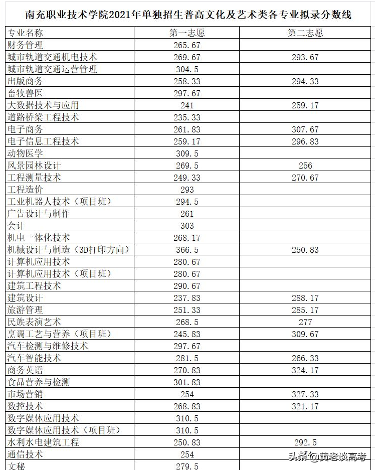 2、成都艺术职业大学2021年单独招生拟录取分数线