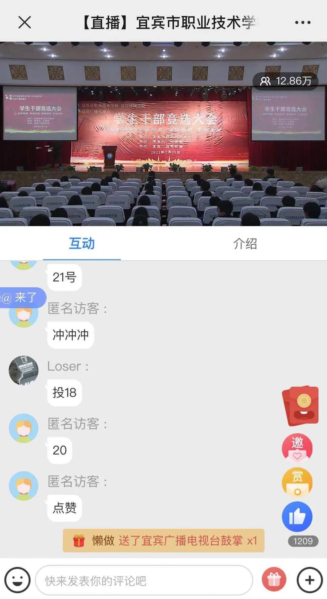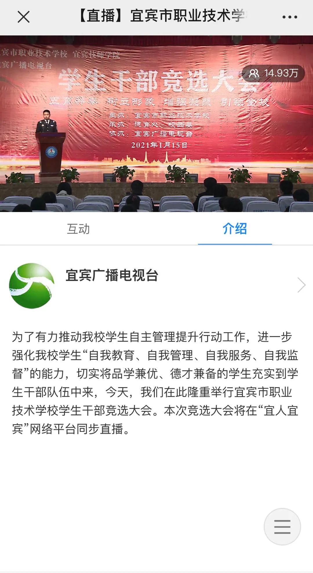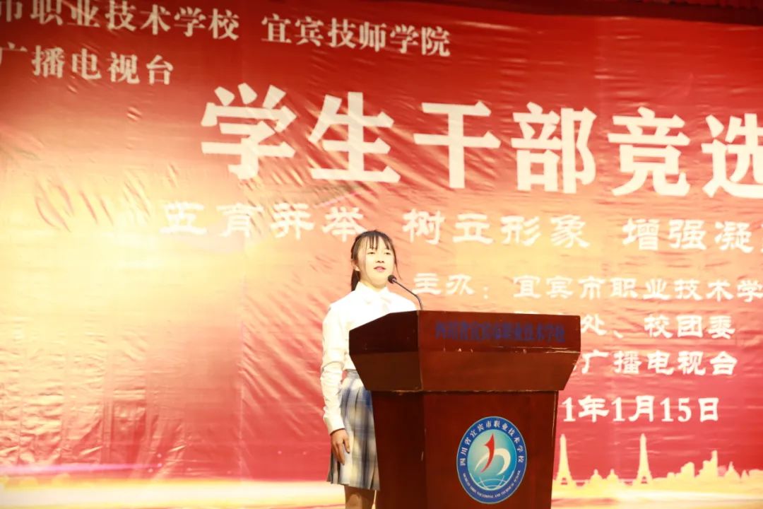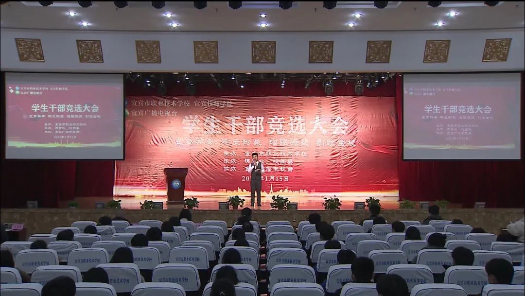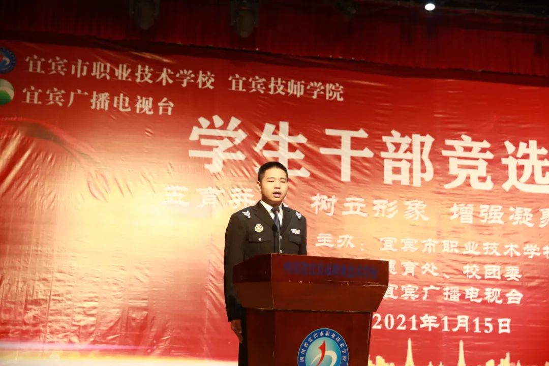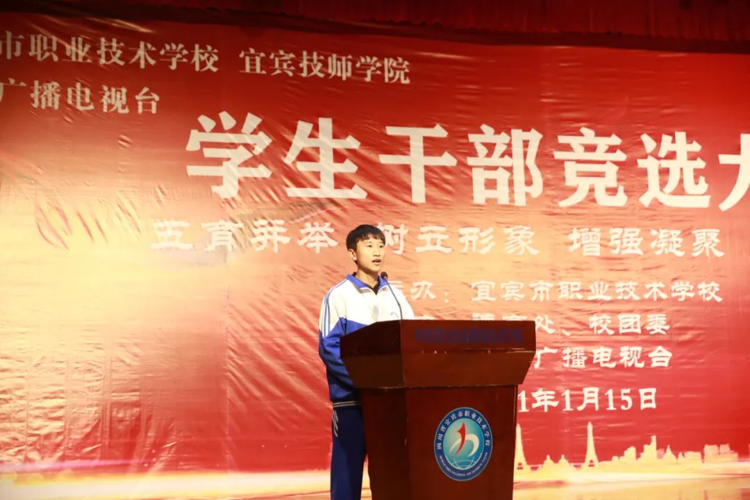 为了有力推动我校学生自主管理提升行动工作,进一步强化我校学生自我教育、自我管理、自我服务、自我监督的能力,切实将品学兼优、德才兼备的学生充实到学生干部队伍中来,我们隆重举行了宜宾市职业技术学校学生干部竞选大会。本次竞选大会还在宜人宜宾网络平台同步直播,最高峰时,点击量达53万人次!