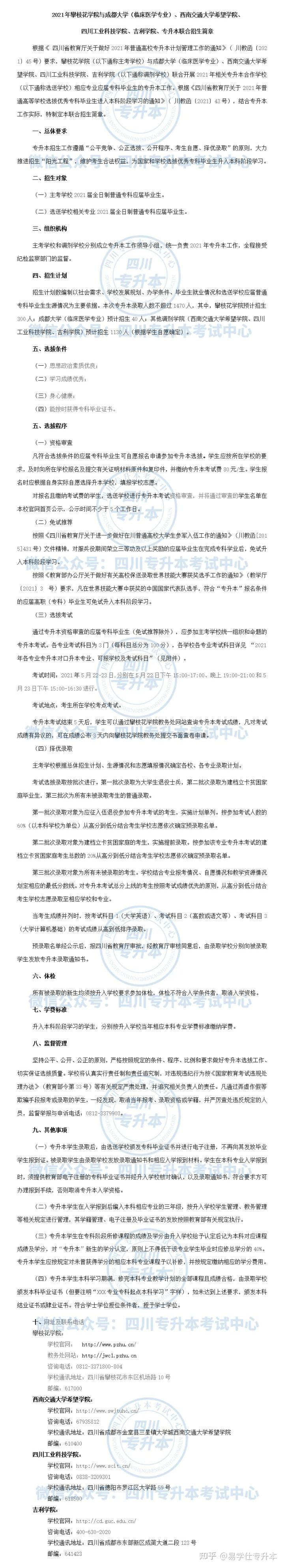 2021年专升本录取人数不超过1470人,其中,攀枝花学校预计招生300人;成都大学(临床医学专业)预计招生40人;其他调剂学校(西南交通大学希望学校、四川工业科技学校、吉利学校)预计招生1130人(根据学生自愿确定)。