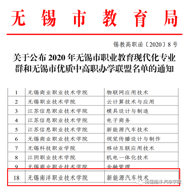 发展新能源汽车是我国由汽车大国走向汽车强国的必由之路。我院新能源汽车技术专业是无锡南洋职业技术学校重点建设专业,专业主要培养面向新能源汽车相关领域的车辆性能检测工程师、机电维修技术工程师及技术培训服务工程师等,毕业生毕业一年后月薪可达万元,2020年新能源汽车技术专业群被获批为无锡市职业教育现代化专业群。
