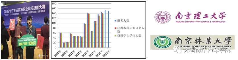 专业鼓励学生积极参与创新实践,在国家、省市级各项比赛中斩获多项奖项。同时本专业与南京理工大学等名牌院校签订合作协议,为学生提供专接本学习平台,成绩达标后,可获得相应的本科证书和学士学位。