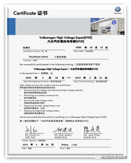 与上汽大众合作的上汽大众电动车培训项目(SCEP),是全国首批校企合作项目,该项目技术实力雄厚,采用订单班培养模式,共享企业培训资源,教学内容与实际生产内容同步,保障毕业生零距离入岗。