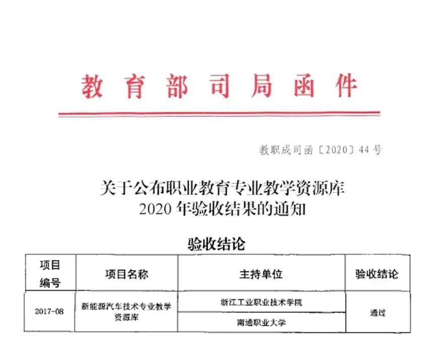 2020年12月31日,学校牵头主持建设的职业教育新能源汽车技术专业教学资源库项目通过教育部验收,代表我院在高等职业院校新能源汽车技术专业的最高水平。