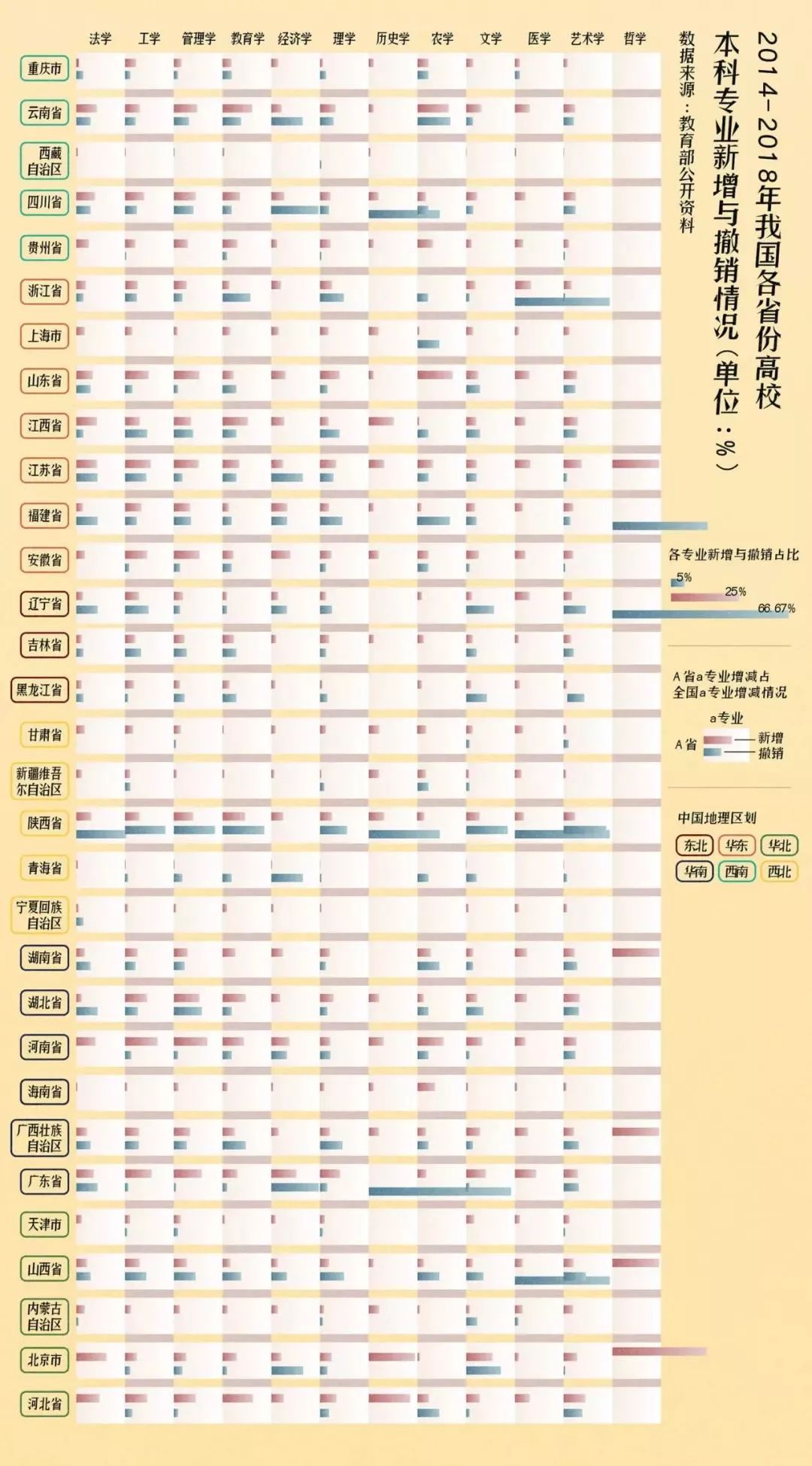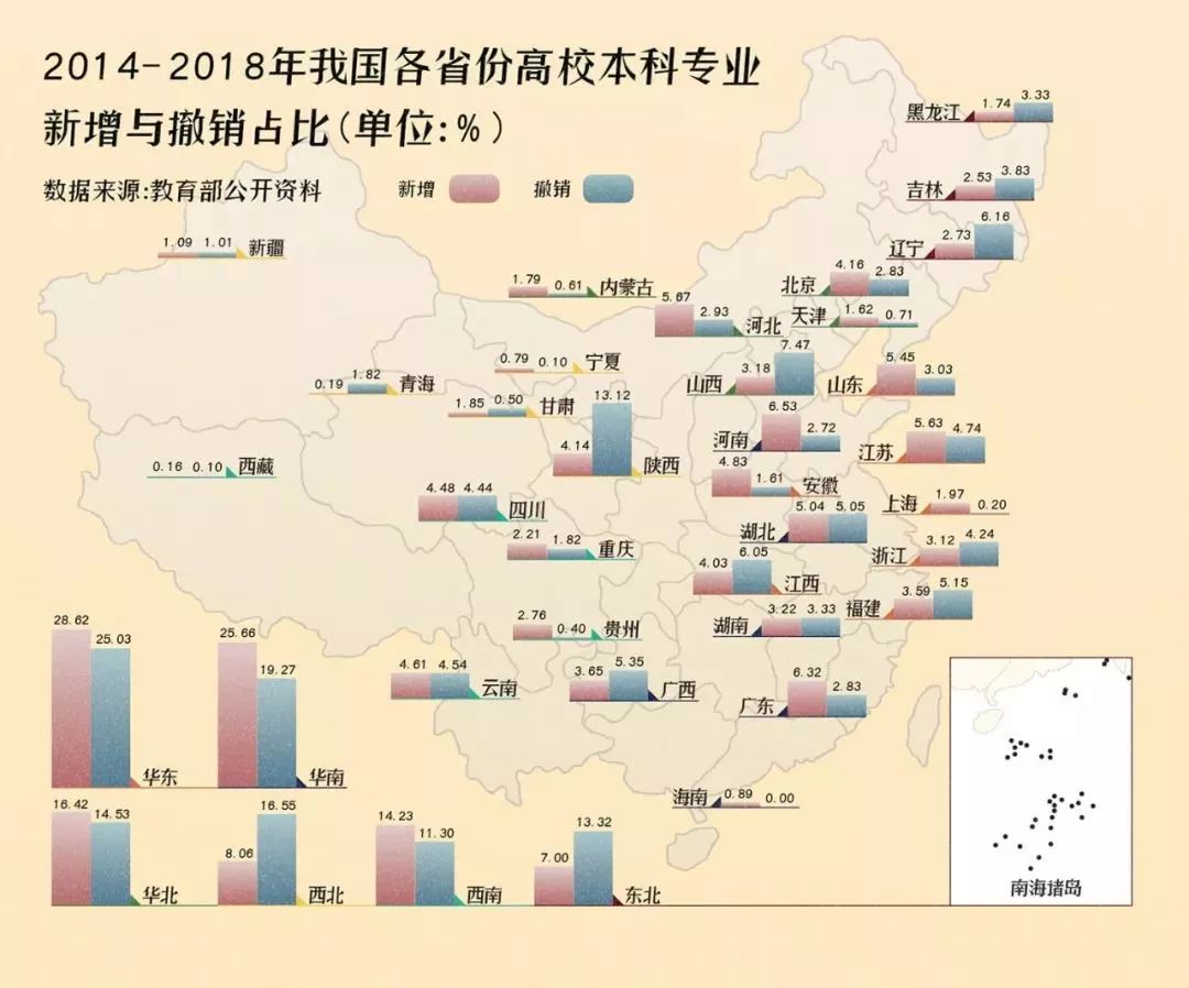 经统计,华东、华南两地是新增与撤销数量占比最高的区域,除了汇集了众多顶尖的高等院校之外,这两地也是我国经济最发达、最具市场活力和投资吸引力的地区。可见,经济社会发展越是繁荣的省份,越重视对人才培养的灵活调整,更致力让高等教育同推动高质量发展的要求相适应。