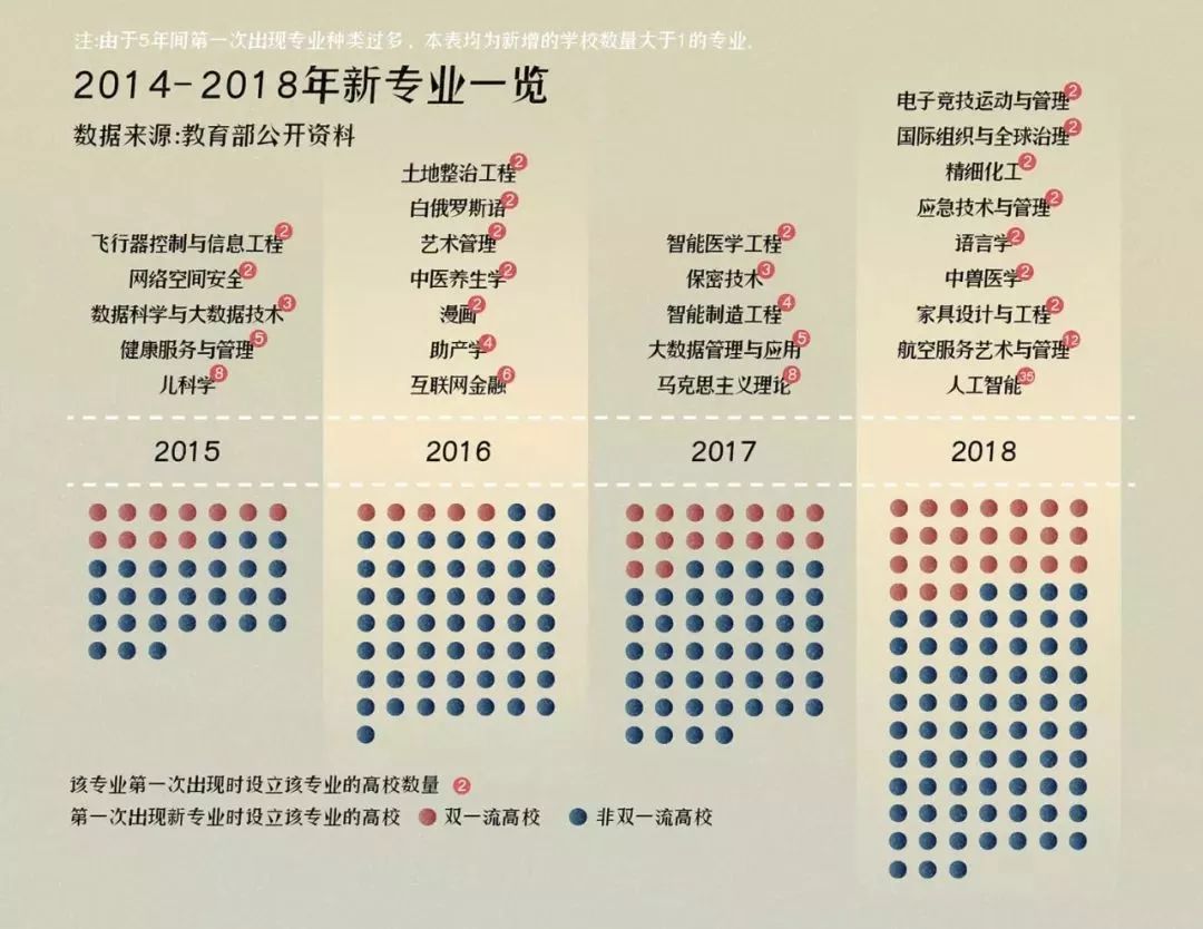 2018年年初,国家层面提出要大力发展新工科、新医科、新农科、新文科,并首批认定612个新工科研究与实践项目,增设外语非通用语种等紧缺专业,基本实现一带一路沿线国家官方语言的全覆盖。在政策的推动下,新兴专业横空出世并迅速成为热门专业。