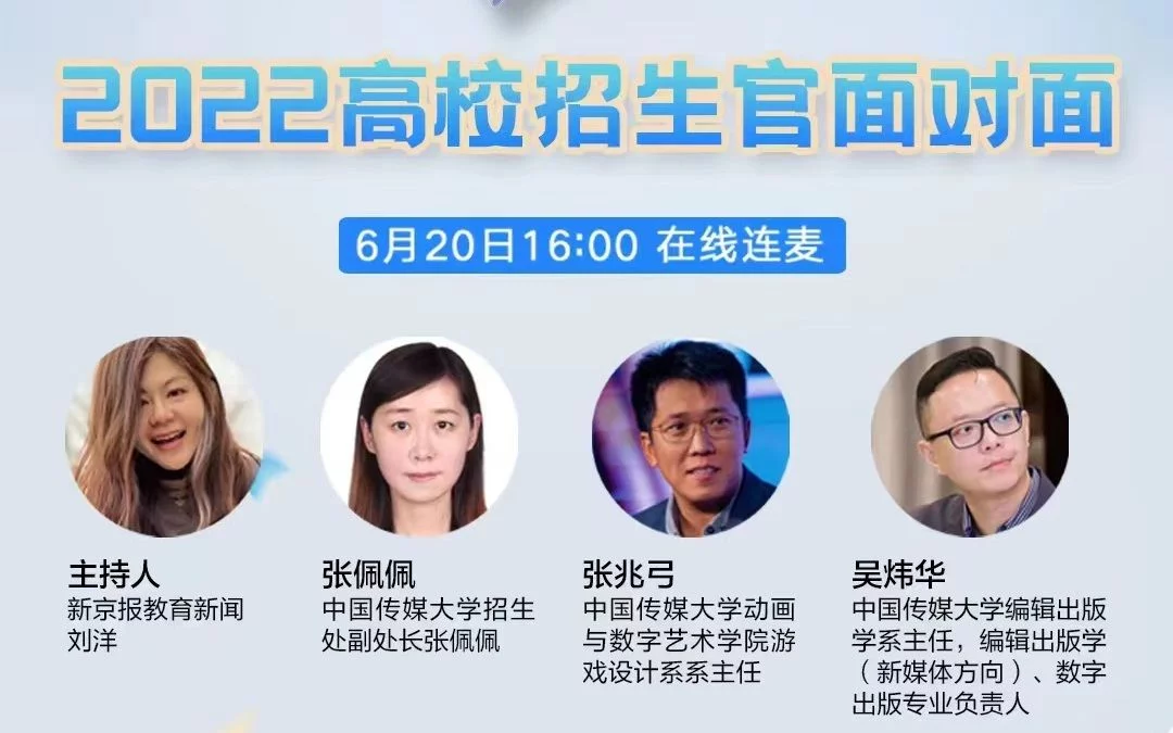 中国传媒大学2022年招生政策与学生培养有哪些特色?今年推出了哪些新专业?学生在就业和深造方面有哪些机会?在6月20日举行2022高校招生官面对面系列活动中,新京报记者通过微博连麦的方式,邀请中国传媒大学招生处副处长张佩佩,编辑出版学系主任,编辑出版学(新媒体方向)、数字出版专业负责人吴炜华,动画与数字艺术学校游戏设计系系主任张兆弓做客直播间,为考生们答疑解惑。