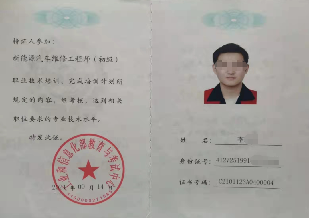 培训人员经考试,成绩合格者获得由工业和信息化部教育与考试中心颁发的新能源汽车维修工程师(初级)证书。