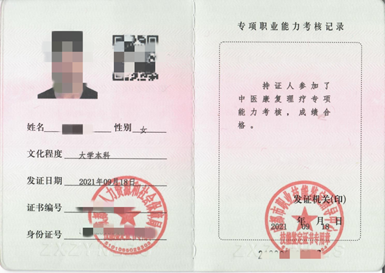 2、结业后,可参加人社部专项职业能力考核,合格者可获得《小儿推拿》、《中医康复理疗》专项职业能力证书,人社官网可查,全国通用。