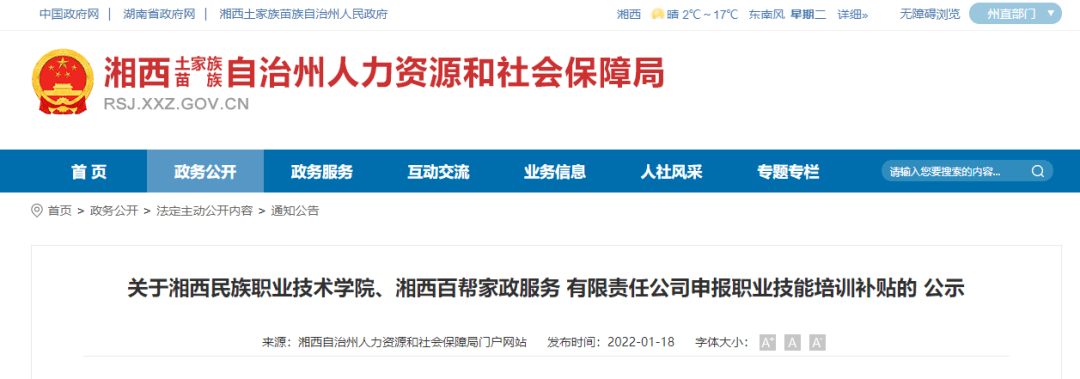 按照《湘西自治州人民政府办公室关于转发<湘西自治州职业技能提升行动实施方案(2019-2021年)>的通知》(州政办发〔2019〕35号)要求,现对湘西民族职业技术学校、湘西百帮家政服务有限责任公司申报职业技能培训补贴情况进行公示(详情见附件):