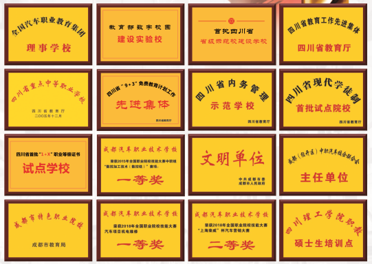 学校是全国汽车职业教育集团理事学校、教育部数字校园建设实验校、四川省重点中等职业学校、四川省教育工作先进集体、首批四川省省级示范校建设学校、四川省"9+3"免费教育计划工作先进集体、四川省首批1+X"职业等级证书试点学校、四川省首批中等职业学校内务管理示范校、四川省现代学徒制首批试点院校、成都市首批特色职业院校、成都市首批国际教育窗口学校、成都市文明单位、成都市先进基层党组织、成都市中等职业学校"好课堂基地校、成都市依法治校示范校、成都市校务公开A级单位、成都经开区中职汽车校企联合会主任单位、四川轻化工大学职教硕士生培训点。