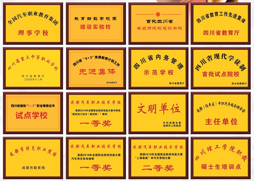 学校是全国汽车职业教育集团理事学校、教育部数字校园建设实验校、四川省重点中等职业学校、四川省教育工作先进集体、首批四川省省级示范校建设学校、四川省9+3免费教育计划工作先进集体、四川省首批1+X职业等级证书试点学校、四川省首批中等职业学校内务管理示范校、四川省现代学徒制首批试点院校、成都市首批特色职业院校、成都市首批国际教育窗口学校、成都市文明单位、成都市先进基层党组织、成都市中等职业学 校"好课堂"基地校、成都市依法治校示范校、成都市校务公开A级单位、成都经开区中职汽车校企联合会主任单位、四川轻化工大学职教硕士生培训点。