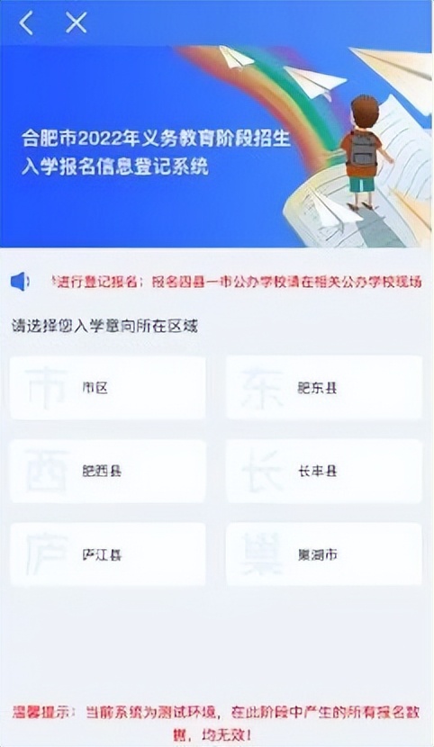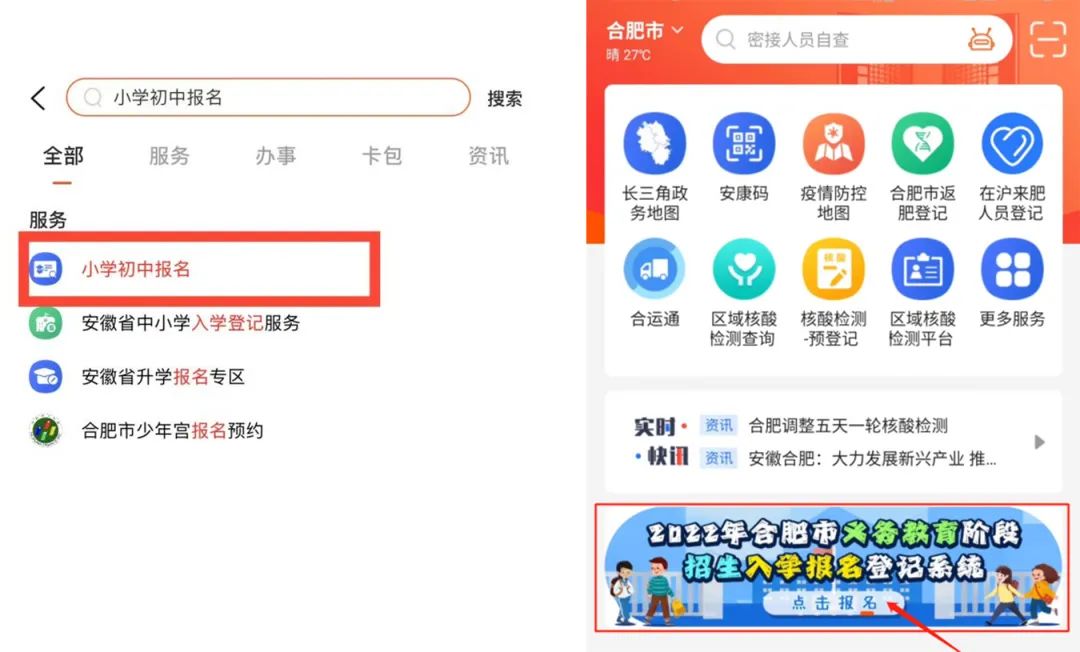 第一步:进入皖事通APP,左上角定位合肥市,搜索小学初中报名,或者通过轮播图进入报名系统。