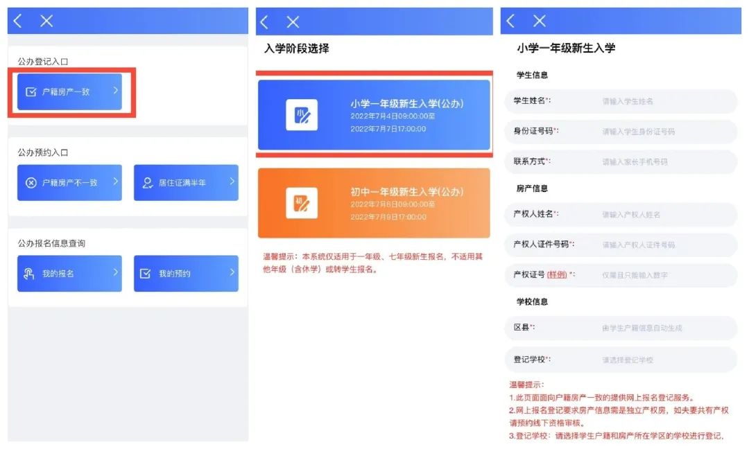 户籍房产一致,进入入学阶段选择页面,选择小学或初中新生入学界面,进入信息填写页面,填写学生信息、房产信息以及登记学校信息后提交,信息提交后不可修改,提交后请等待招生工作人员审核。