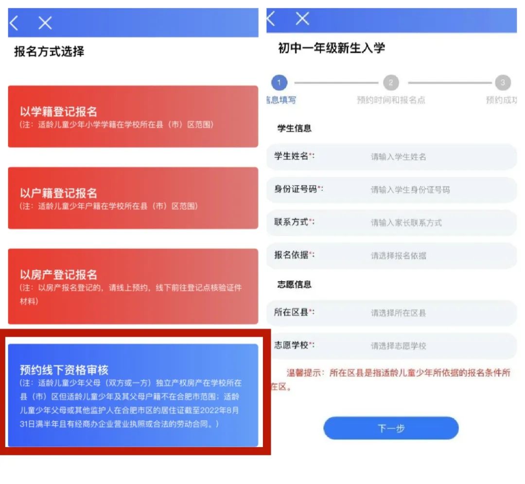不满足户籍等在线报名条件时,点击预约线下资格审核预约线下审核材料,填写相关信息,并确保信息真实有效(注:预约成功后不可修改或取消预约)。其中志愿学校仅为意愿的学校,最终以线下审核结果为准,选择报名点时,建议根据房产、居住证或其他材料所属的县区选择报名点就近进行线下材料核验。