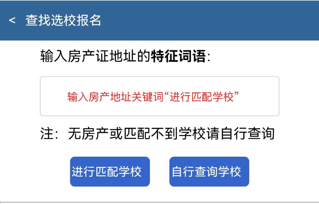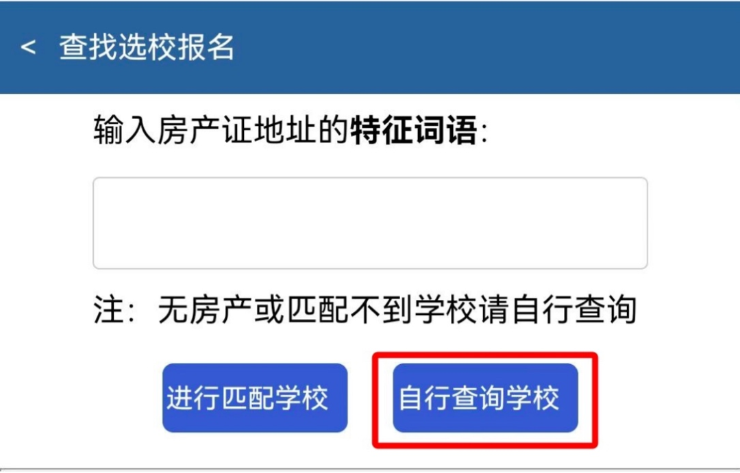 点击自行查询学校,选择该学校所辖城区教育局,找到对应学校,点击报名。