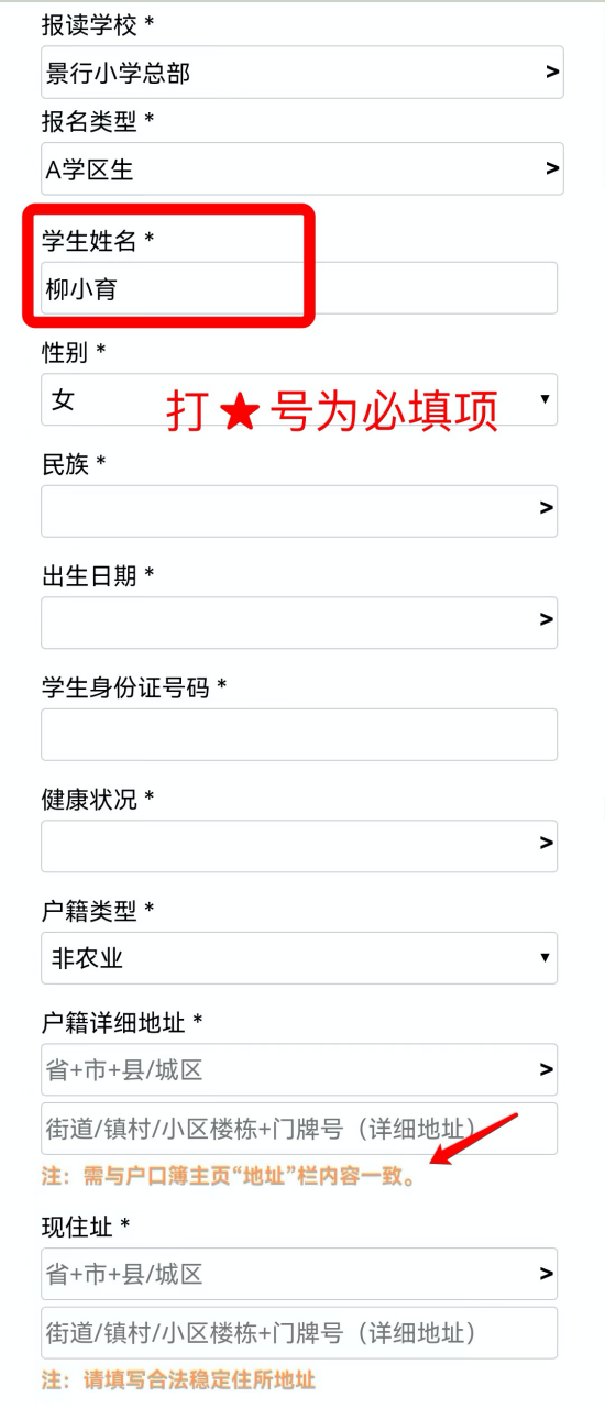 4、按要求填写学生相关信息,打★号为必填项,其他为选填项。填写信息时请先浏览红色字体的注意事项,然后根据要求拍照上传相关材料。