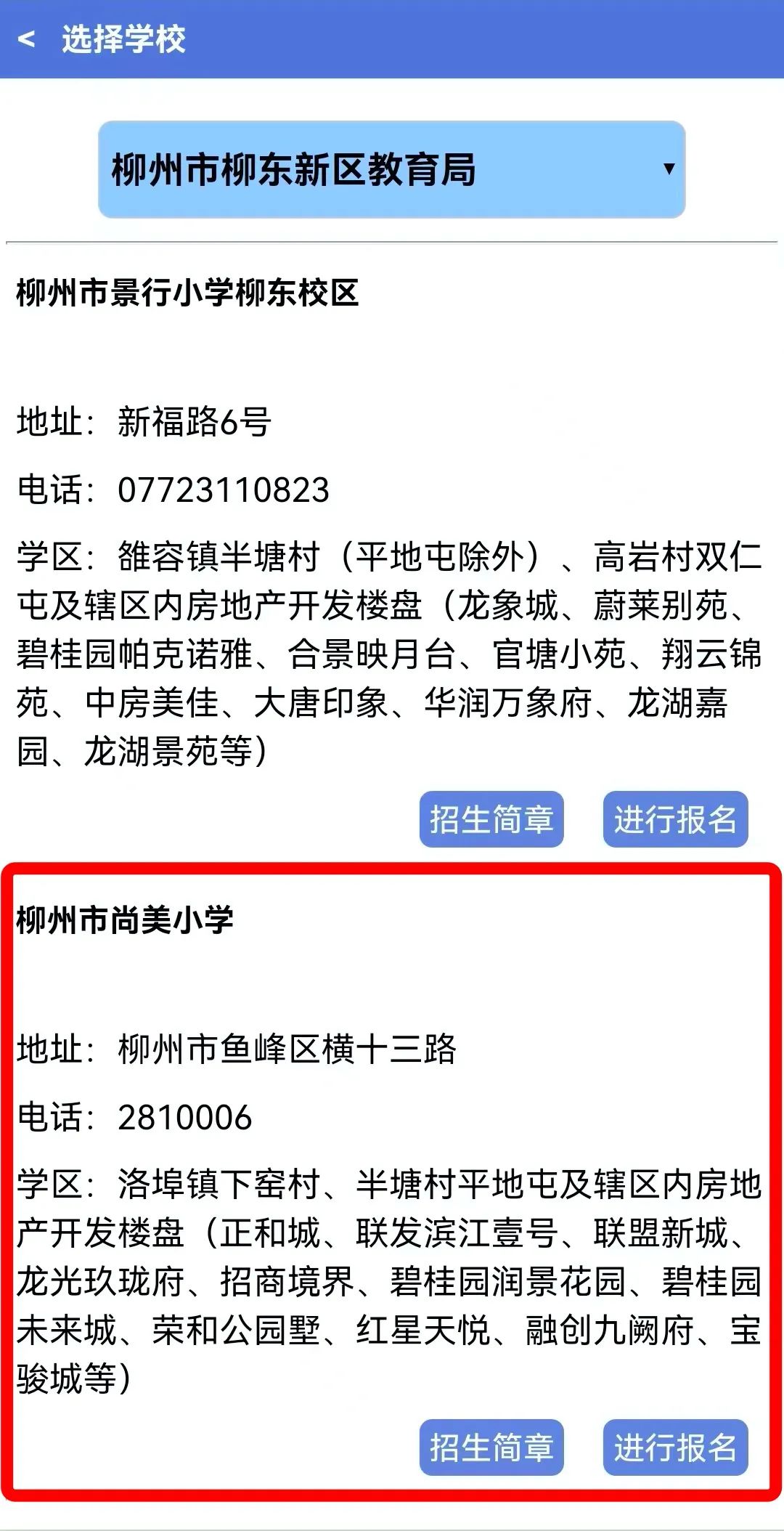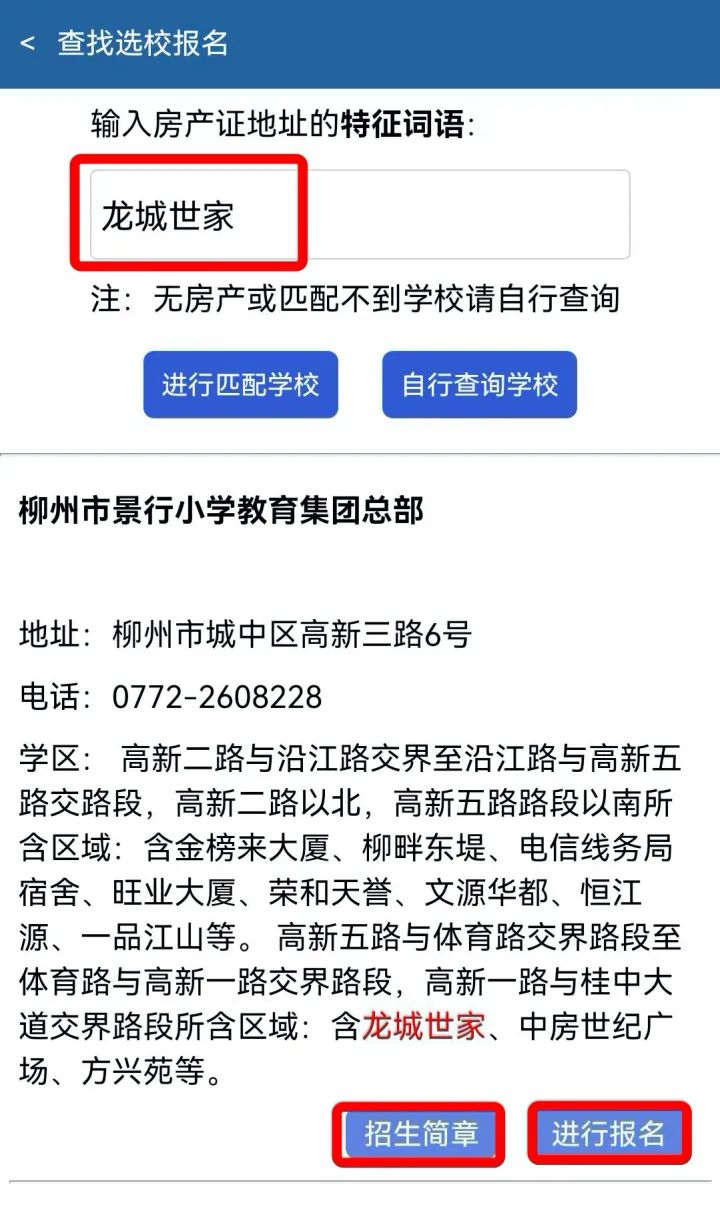 输入房产地址关键词进行匹配学校,找到对应学校,查看招生简章→点击进行报名。