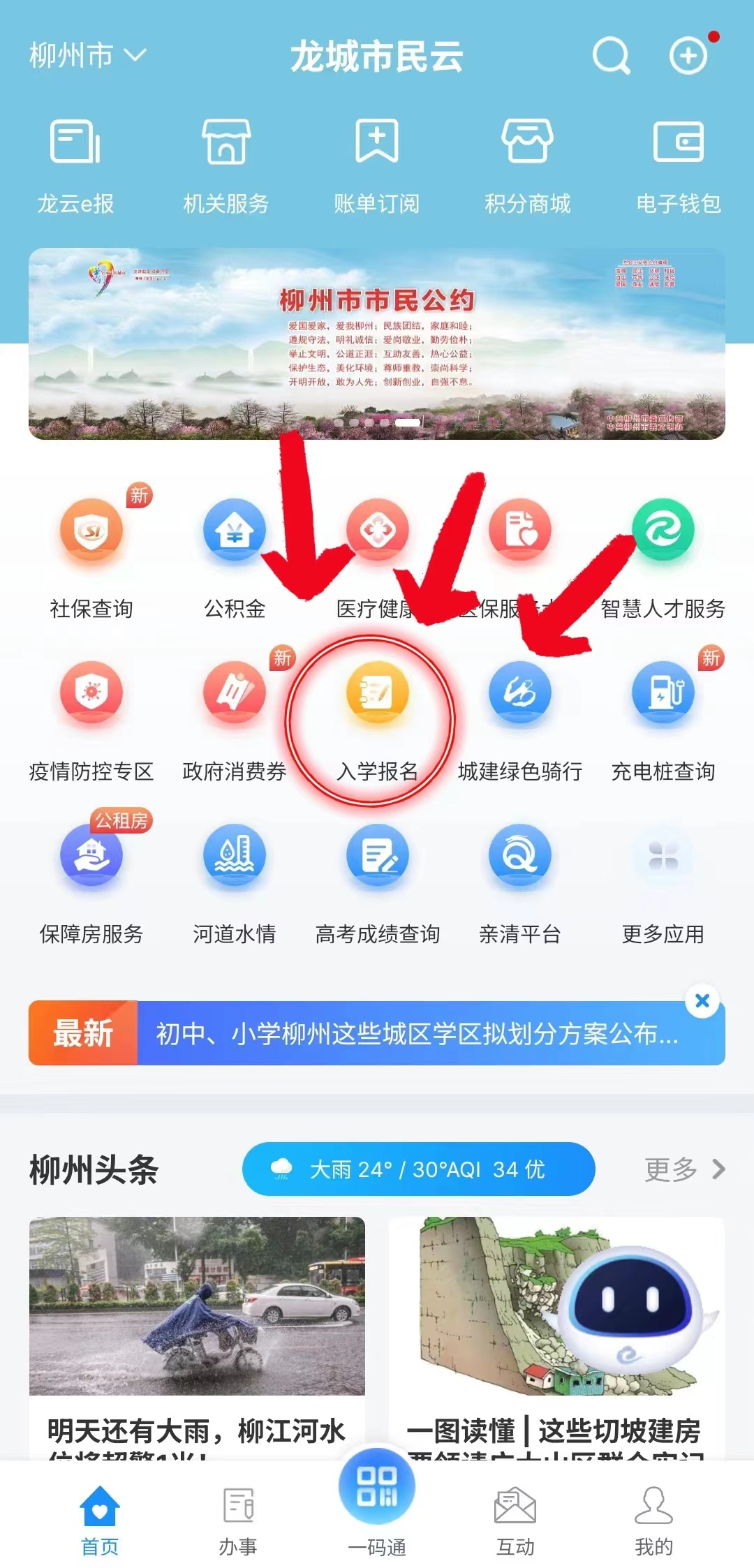 1.进入龙城市民云界面,点击入学报名,进入报名平台