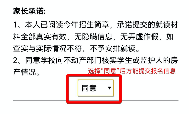5.浏览家长承诺后需要选同意方可提交报名信息。