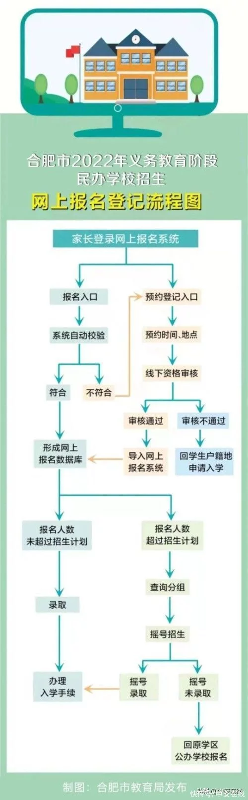 6月22日,据合肥市教育局发布微信公众号消息,2022年6月5日,合肥市教育局印发《关于做好合肥市2022年义务教育招生入学工作的通知》。为方便家长了解合肥市2022年义务教育阶段民办学校招生网上报名相关工作,绘制了登记流程图,并就学生和家长普遍关心的热点问题予以解答。