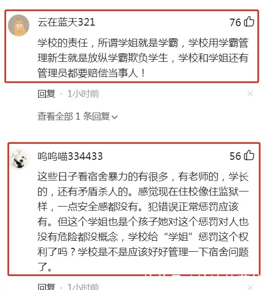 学生会和老师有这种惩罚机制也好,现在这种情况必须有人需要承担责任。网友云在蓝天321:学校的责任,所谓学姐就是学霸,学校用学霸管理新生就是放纵学霸欺负学生,学校和学姐还有管理员都要赔偿当事人!和网友呜呜喵334433:这些日子看宿舍暴力的有很多,有老师的,学长的,还有矛盾杀人的。感觉现在住校像住监狱一样,一点安全感都没有。犯错误正常惩罚应该有。但这个学姐也是个孩子她对这个惩罚对人也没有危险都没概念,学校给学姐惩罚这个权利了吗?学校是不是应该好好管理一下宿舍问题了。