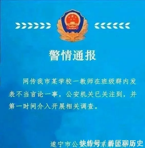 2月24日,四川遂宁警方对外通报称,网传我市某学校一教师在班级群内发表不当言论一事,公安机关已关注到,并第一时间介入开展相关调查。