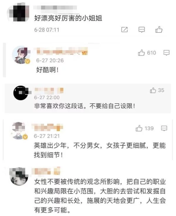女性不要被传统的观念所影响,把自己的职业和兴趣局限在小范围,大胆地去尝试和发掘自己的兴趣和长处,施展的天地会更广,人生会有更多可能。