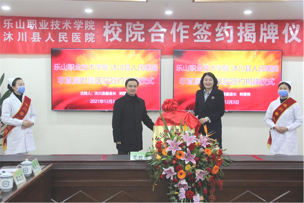 四川新闻网消息 12月3日上午,乐山市职业技术学校 沐川县人民医院非直属附属医院签约暨揭牌仪式在我院隆重举行,标志着沐川县人民医院与地方高校合作迈出了具有重要历史意义的一步。乐山职业技术学校党委书记易群、副院长封家福、医护系主任张知贵、教务处副处长邓盼盼、医护系副主任董玉洁,沐川县委副书记、县长赵星、县委常委、宣传部部长魏蔚、副县长韩雪梅、县卫健局党组书记、局长温友强,县人民医院党政领导班子成员和中层干部参加此次仪式,仪式由副县长韩雪梅主持。