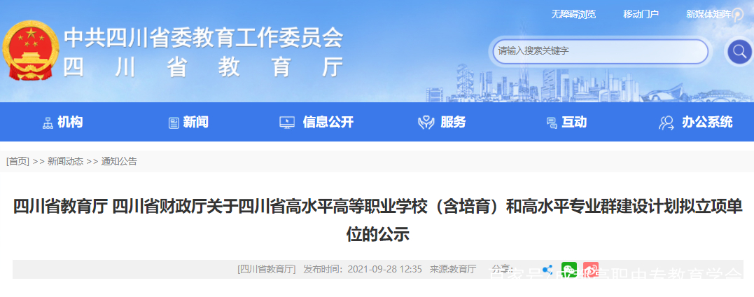 刚刚,四川省教育厅、四川省财政厅发布《关于四川省高水平高等职业学校(含培育)和高水平专业群建设计划拟立项单位的公示》。