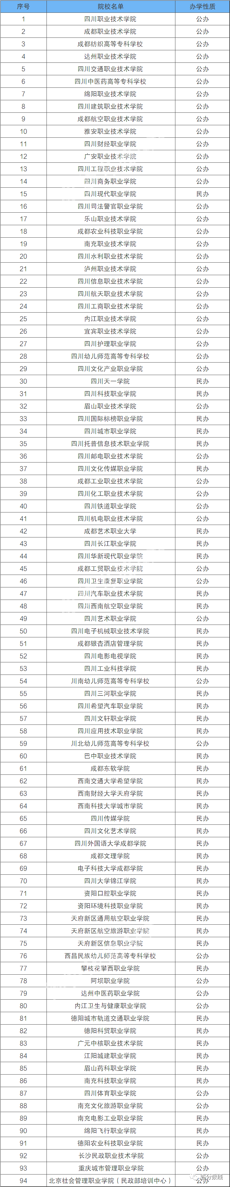 根据官方公布的消息可以得知,四川省2021年单招院校共计有94所,其中14所为本科院校。在所有名单中,有三所院校不在省内,包括长沙民政职业技术学校、重庆城市管理职业学校、北京社会管理职业学校(民政部培训中心)等,大家在填报志愿的时候,需要注意一下,下面是具体的名单汇总: