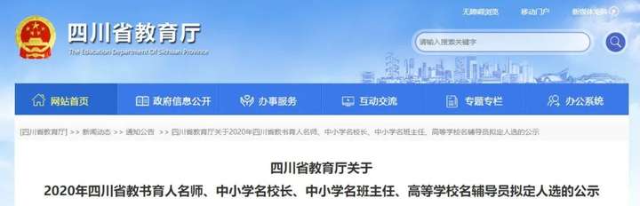 根据《四川省教育厅关于开展2020年四川省教书育人名师、中小学名校长、中小学名班主任、高校名辅导员遴选工作的通知》(川教函〔2020〕356号)要求,经各市(州)教育行政部门、高等院校及省直有关部门遴选推荐,省教育厅组织评审,现将拟定的2020年四川省教书育人名师、中小学名校长、中小学名班主任、高等学校名辅导员人选予以公示。