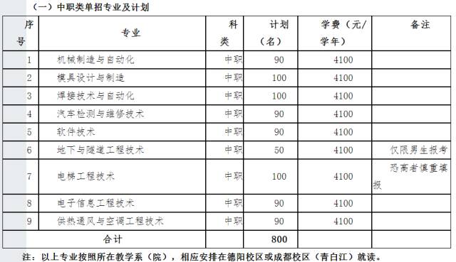 中职类共有9个专业:机械制造与自动化90名、模具设计与制造100名、焊接技术与自动化100名、汽车检测与维修技术90名、软件技术90名、地下与隧道工程技术50名、电梯工程技术100名、电子信息工程技术90名、供热通风与空调工程技术100名。