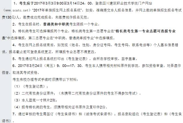 一、单独招生计划学校2017年单独招生计划2000名,其中:中职类800名、特长类225名、普通类975名。招收藏区、彝区9+3应届毕业生的单独招生名额另行公布。二、报名时间学校2017年单独招生报名时间:2017年3月3日9:00至3月14日24:00,登陆四川建筑职业技术学校门户网站(www.scatc.net)2017年单独招生网上报名系统进行网上报名。三、咨询电话0838-2651788,2651228,2652947(传真)