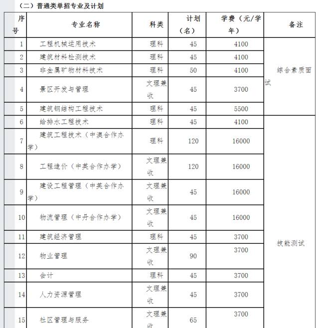普通类共有17个专业:工程机械运用技术45名、建筑材料检测技术45名、非金属矿物材料技术50名、景区开发与管理45名、建筑钢结构工程技术45名、给排水工程技术45名、建筑工程技术(中澳合作办学)120名、工程造价(中英合作办学)120名、建设工程管理(中英合作办学)45名、物流管理(中丹合作办学)45名、建筑经济管理45名、物业管理90名、会计45名、人力资源管理45名、社区管理与服务65名、城市轨道交通运营管理45名、数字媒体应用技术35名。