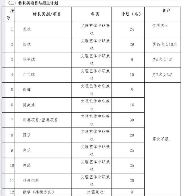 特长项目共12个:足球24名(仅限男生)、篮球29名(男19、女10)、羽毛球9名(男5、女4)、乒乓球10名(男7、女3)、桥牌8名、健美操16名、田赛项目/径赛项目30名、器乐20名、声乐25名、舞蹈25名、科技创新20名、数学(建模方向)9名。