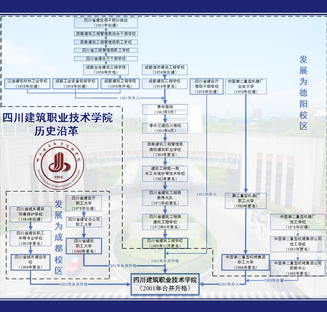 2001年,经四川省人民政府批准,原四川省建筑工程学校、原四川省建筑职工大学、原四川省城市建设学校合并组建四川建筑职业技术学校。