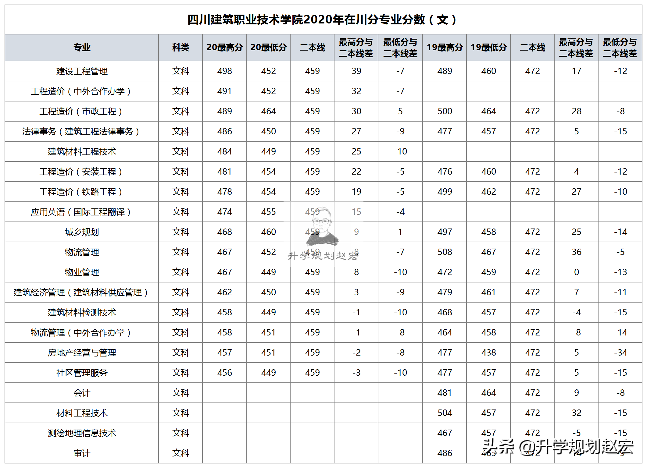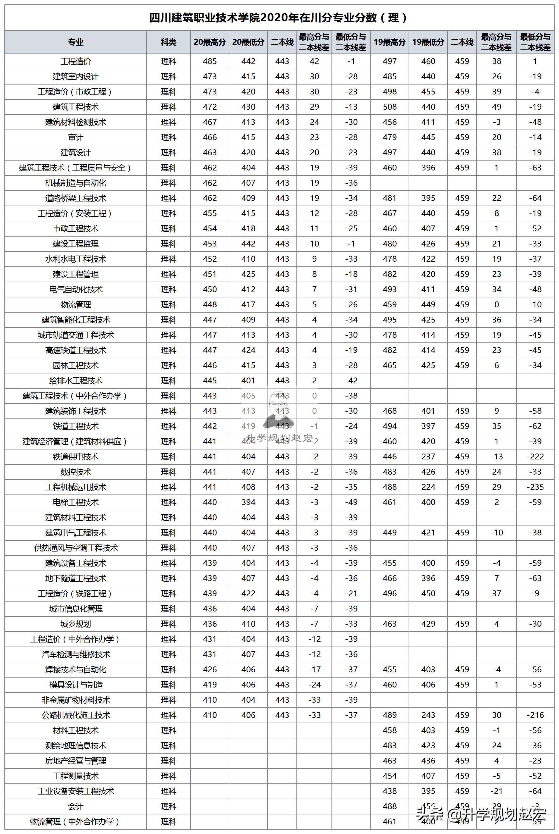 2020年各个大学的分专业分数都在公布,前面的文章都是本科院校的专业分数情况,本文来看看,专科院校中以建筑为特色的四川建筑职业技术学校2020年在四川的招生的情况;最高分文科498分,超二本线39分,理科485分,超二本线42分;有30多个专业的最高分超过二本线,专业最低分也是多个专业在二本线附近,另外专升本达到了16.88%,值得报考么?