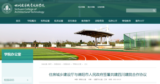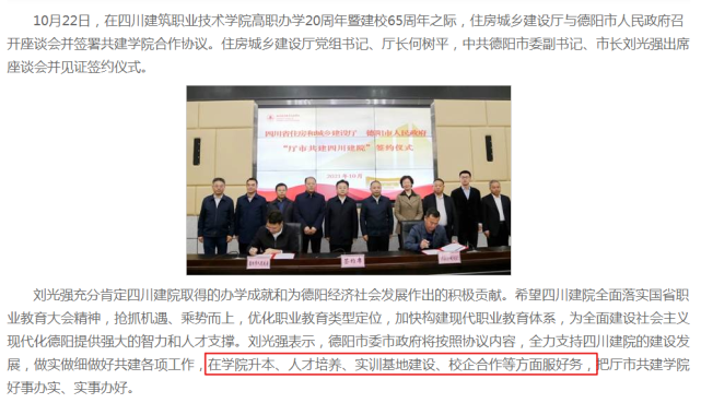 2021年11月,四川省住房城乡建设厅、德阳市人民政府在四川建筑职业技术学校高职办学20周年暨建校65周年之际,召开座谈会并签署共建学校合作协议。协议内容指出全力支持四川建院的建设发展在学校升本、人才培养、实训基地建设、校企合作等方面服好务。