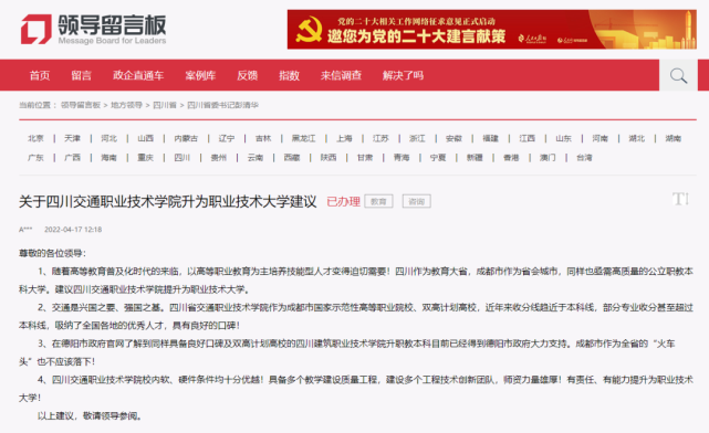 2022年4月,在人民网领导留言板块,有网友提出关于四川交通职业技术学校升为职业技术大学建议。