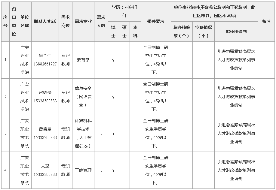 1.广安职业技术学校2019年下半年小平故里英才计划引进急需紧缺专业人才 需求计划表(附后)