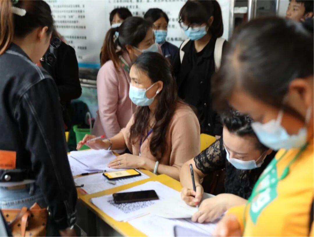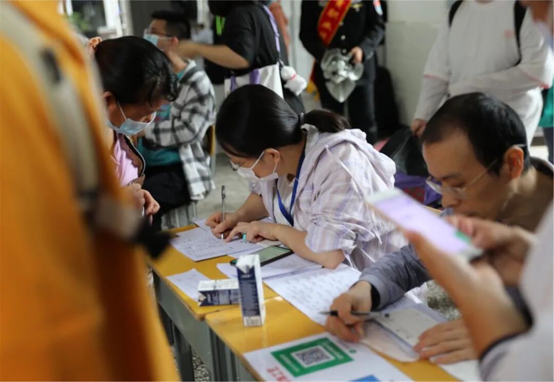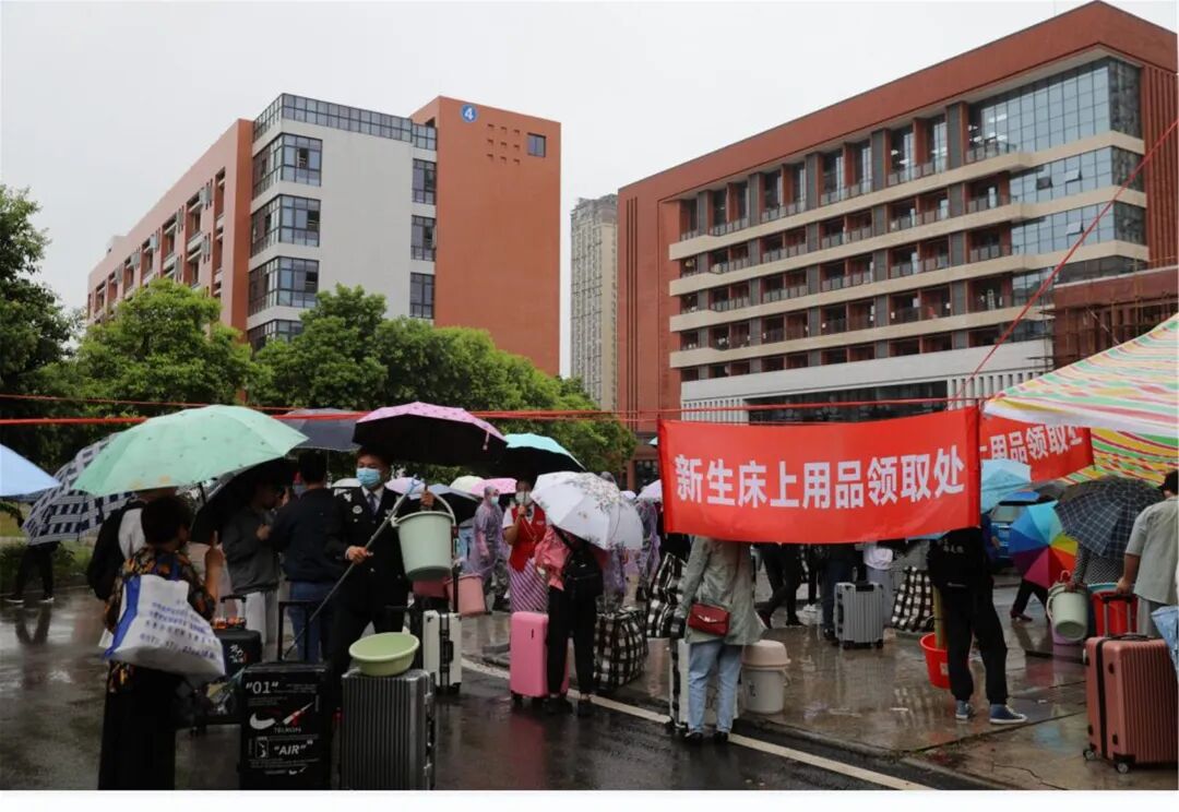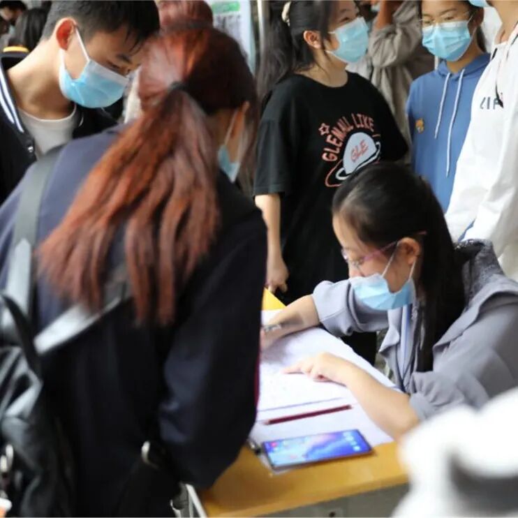 ●一大早,学校两委会学生干部就已在各路口就位,热情迎接报名的学生和家长。学校严格落实疫情防控要求,亮码扫码、体温检测、查验疫苗接种后方可进校报到。