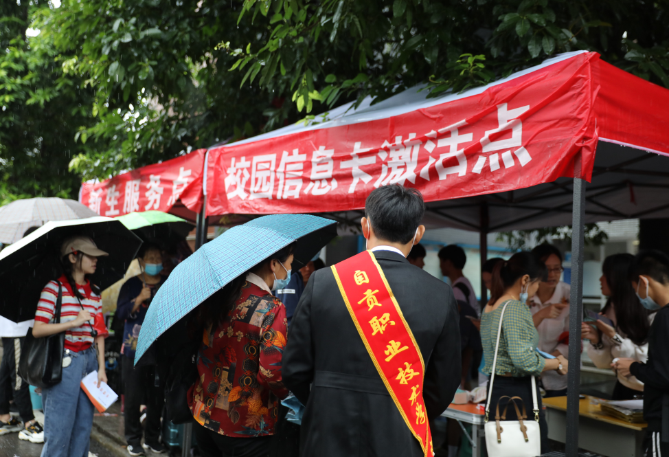 ●8月28日上午,虽然天空下着雨,但是自贡职业技术学校校园却早已人头攒动,来自市内外的3000余名新生在家长的陪伴下陆续到校报到。报到现场人声鼎沸,场面火爆。