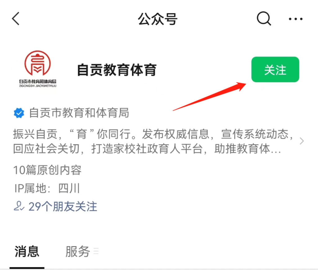 一、关注自贡市教育局微信公众号自贡教育体育或扫描下方二维码进入公众号;