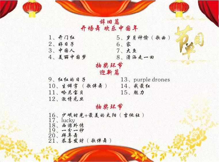 晚会在欢快的开场歌舞《开门红》中拉开帷幕,《岁月神偷》《生僻字》《少岷时光+最美的太阳》《恭喜发财》等歌曲唱出了少岷职校师生朝气蓬勃、积极向上的风貌;《好日子》《中国人》《美丽中国梦》《红红的日子》《激情元旦》《拜年舞》等歌舞展示了少岷职校师生顽强拼搏、坚韧不拔的优秀品质。整场晚会异彩纷呈、惊喜不断,引起师生欢呼不断。
