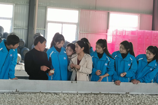 全国中职教师教学技能大赛获奖者张婷老师带领她的团队与2021级部分学生,深入杨疃镇杨集村食用菌生产基地,查看食用菌生长情况,并针对双孢菇生产中出现的问题,提出解决方案。接着,师生们就食用菌栽培注意事项、常见疾病处理等方面内容与农户进行了交流,并提出了一系列建议。