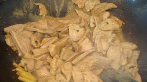 起锅烧油,在锅内倒入适量的油,烧至八成热,下入腌制好的猪肝。猪肝滑散后捞出,时间大约为10秒左右,将原来锅内剩余的油爆香姜蒜片,小火煸炒黄豆酱,煸炒至香味溢出。